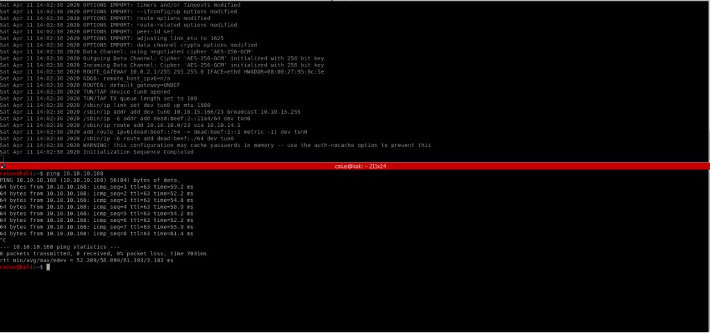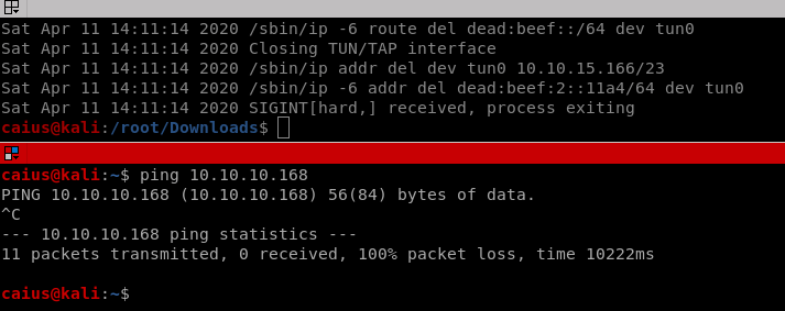 Tässä kuvassa meillä on siis 2 terminaalia auki, toinen näyttää openvpn yhteyden, ja toinen on pingaamista varten. Kuten näemme, pystyimme openvpn päällä pingaamaan laitetta 10.10.10.168 onnistuneesti, eli meillä on yhteys siihen. Nyt mikäli pystymme pingaamaan sitä vielä openvpn pois päältä, tarkoittaa se että emme jostain syystä pingaa oikeaa laitetta, sillä meillä ei pitäisi olla yhteyttä tähän laitteeseen ilman openvpn yhteyttä. Kokeillaan: