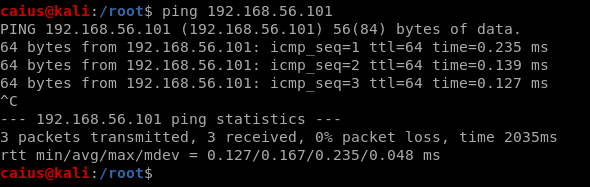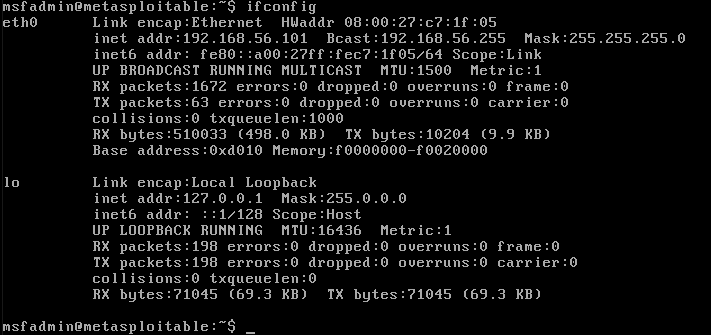 Nyt kun meillä on metasploit päällä, on varmaan aika tarkistaa että saammekö edes yhteyden kohteeseemme eli metasploitable 2 laitteeseen. Näiden molempien laitteiden pitäisi olla samassa lähiverkossa, mutta kummallakaan ei pitäisi olla esimerkiksi pääsyä internettiin (metasploitable 2 näkyvissä nettiin on huono idea, koska se on todella vulnerable laite).