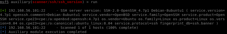 Kokeilin vielä lopuksi sellaista ominaisuutta kuin SSH skanneri, joka tutkii mikä ssh versio palvelimella juoksee. Samantyyppinen kuin port scan, mutta antaa enemmän informaatiota. Voimme ottaa sen käyttöön komennolla “use auxiliary/scanner/ssh/ssh_version“. Options näyttää seuraavalta:
