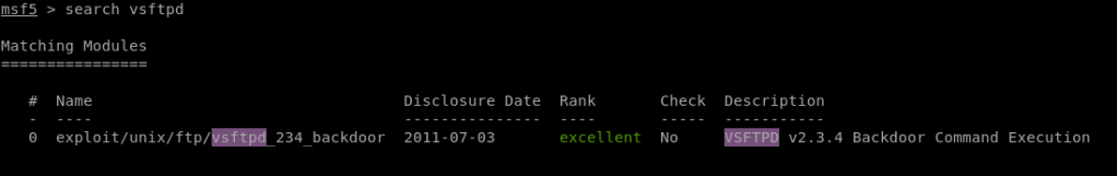 Tämä etsii meille kaikki vsftpd liittyvät moduulit. Löydämme vain yhden: