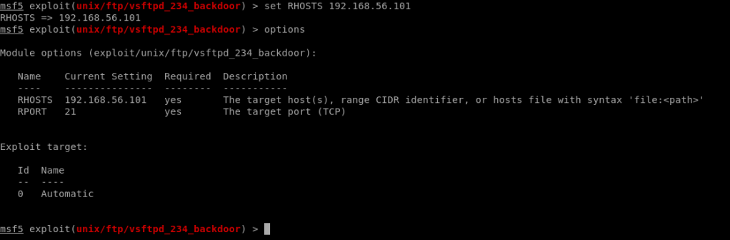 Meillä on 2 asetusta mitkä vaaditaan tämän exploitin toimimiseksi. RHOSTS ja RPORT. Kohdassa RHOSTS ei ole by default mitään, ja tämä on siis kohdekoneen IP. Kohdassa RPORT on valmiiksi port 21, sillä port 21 on se perusportti millä tämä vsftpd palvelu juoksee. Portti 21 on oikein, joten meidän pitää vain laittaa kohtaan RHOSTS kohteemme ip, eli 192.168.56.101. Voimme tehdä sen tällä komennolla: