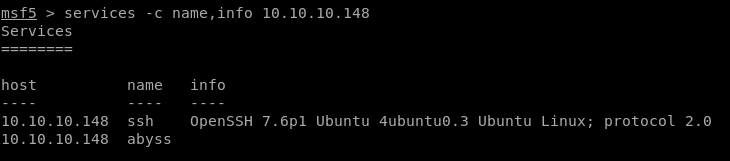 Tuolla tavalla voimme nähdä myös servicet. Portinkin saa näkyviin lisäämällä aiempaan komentoon port osuuden, esimerkiksi “services -c name,port,info <ip_osoite>“.
