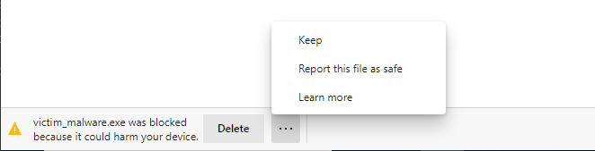 By the way, “Real time protection” at the top is basically the essence of Windows Defender, turning that off will prevent it from detecting our files basically. Now, time to download some of those malware files we made! By the way, when downloading the file, you’ll likely get a warning like this: